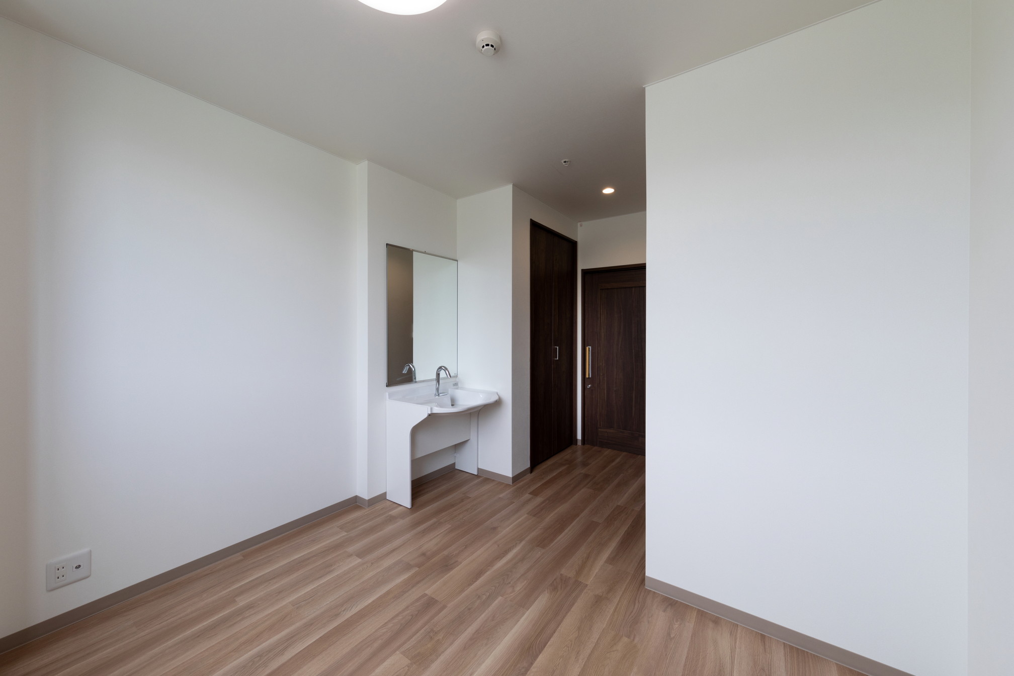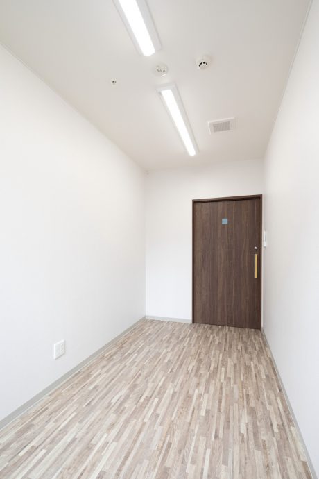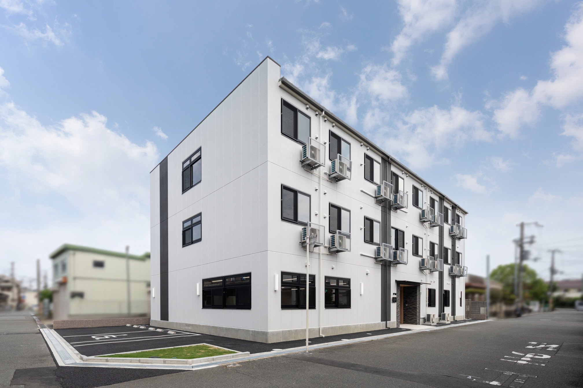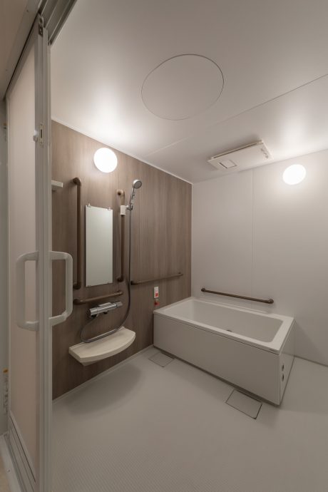 スクエアなフォルムに外壁材がALCパネルということもあり、無機質な外観にならないよう、外壁色はホワイトをベースにチャコールグレーの縦帯状のラインを数本入れました。住宅街に建つ老人ホームということで、シンプルで街並みに調和しつつ、落ち着いた雰囲気を感じられる配色としました。