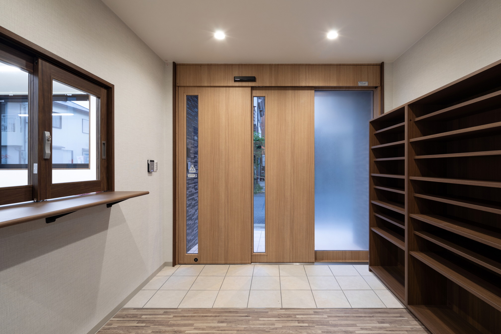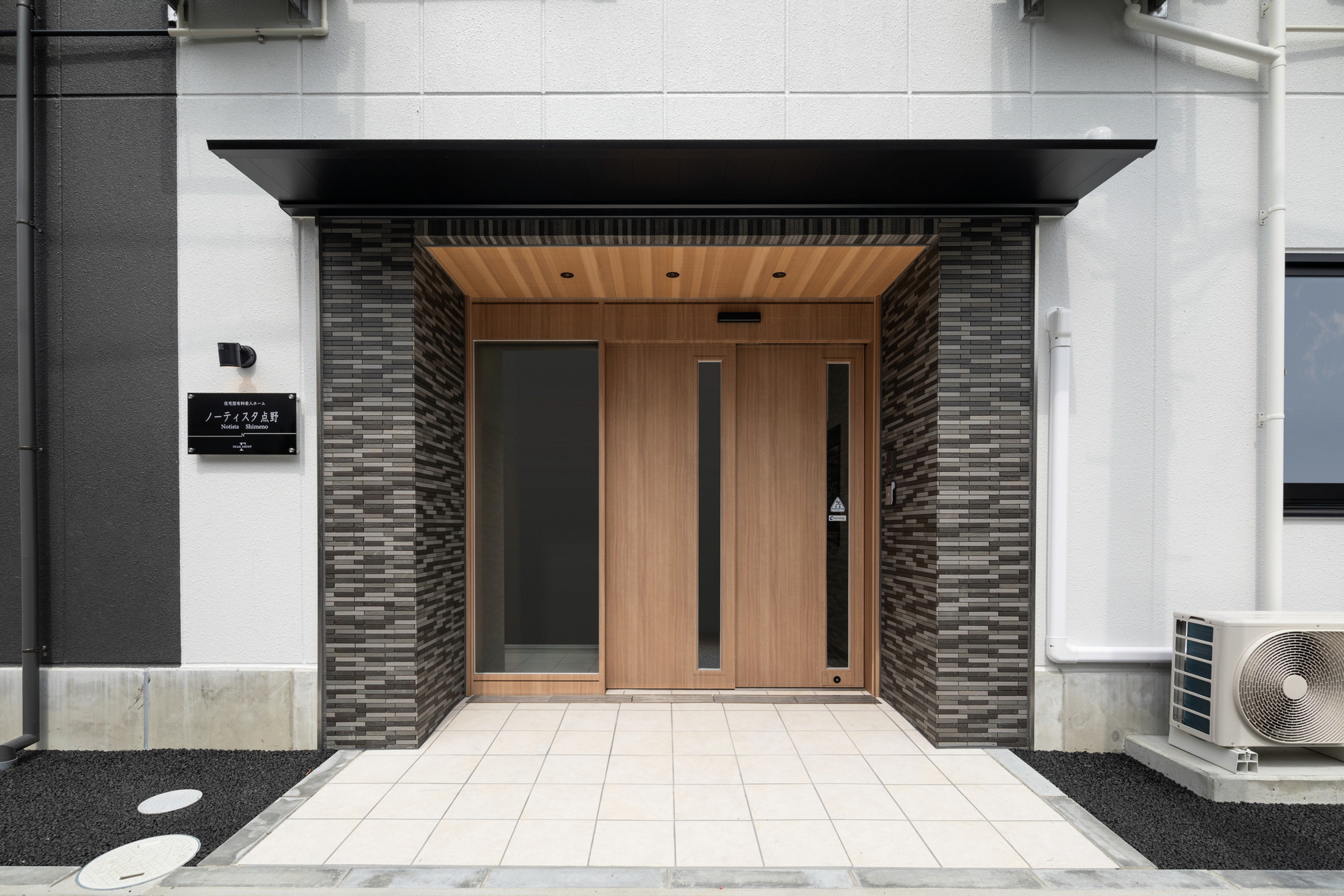 建物の「顔」となる玄関ドアは木目調とし、その回りにはグレー系の細目のタイルを貼ることにより、温もりと高級感を兼ね備えた表情を演出しました。